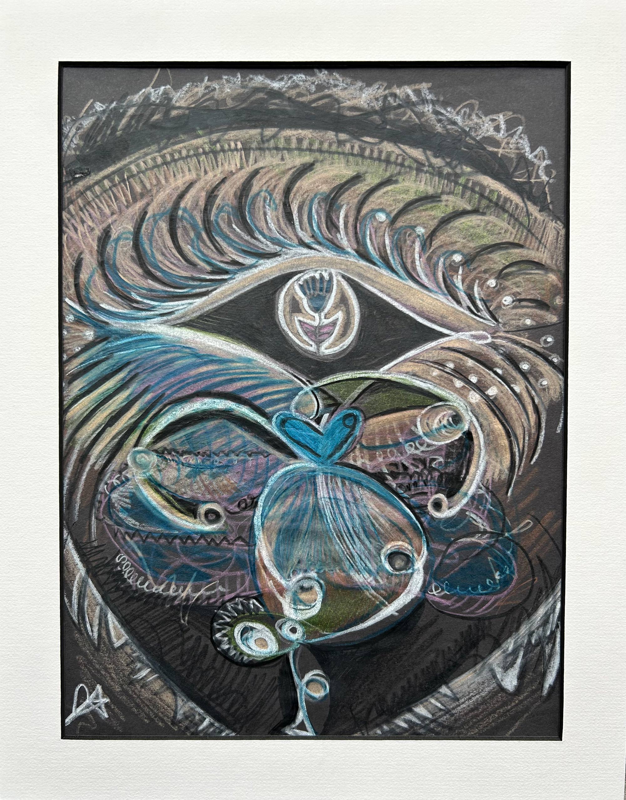 Original, handmade colored pencil drawing on black construction paper. This female eye creature is amongst chaos yet she elegantly dances through it, like a ballerina. 8.5″ x 11″ paper, fits nicely inside an 11″ x 17″ frame with a custom cut matte frame.