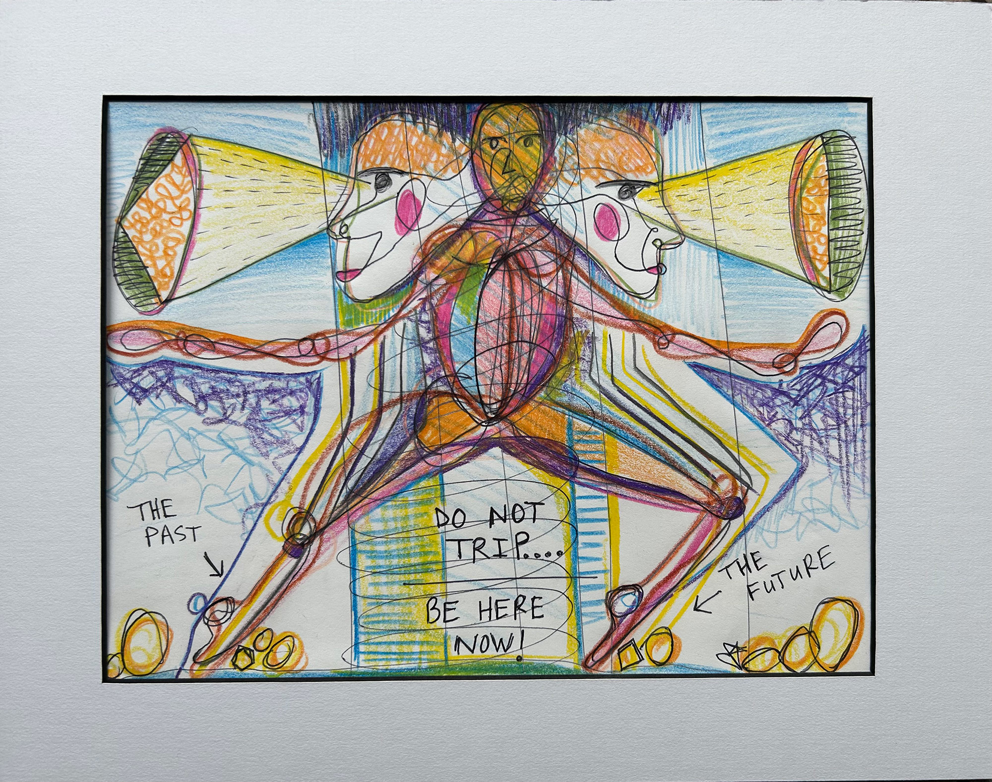Do Not Trip… Be Here Now! This image depicts a human form that is stationed between the Past and the Future, with rocks assembled on either side, suggesting, as we perceive the past and future in the present moment, it’s important to not get hung up on the what if’s or what was happenstance of our lives. We are constantly floating right in-between. Pen, Pencil, and Colored Pencil drawing on an 8.5″ x 11″ paper. Fits nicely in an 11″ x 17″ frame, with a custom cut matte board.