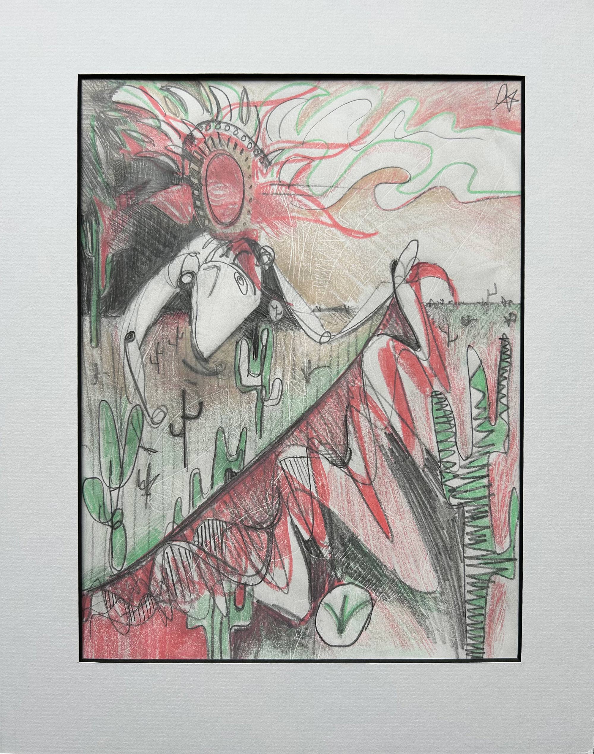 A vision of a female robot, a cyborg of type, without legs and miraculously being held up in fact, by a simple, red, cape-like garment or blanket, like a muleta, that she holds similarly to a “corrida de torros”. With reference to Mexican bullfighting, this female cyborg stands but does not stand at all. She is ushering in the calmness of the desert while patiently waiting. Surrounded by cacti, she is balanced and motionless yet the garment, while delicate, is strong and somehow holding her entire structure up from falling. A plain pencil drawing with colored pencil adornment, on an 8.5″ x 11″ paper. Fits nicely in an 11″ x 17″ frame and comes with a custom cut matte board for framing.